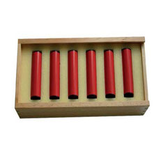 Cilindros de plástico de 7 cm. de largo y de 25 mm de diámetro. Estos cilindros están rellenos de piezas que producen sonidos diferentes. Caja de madera. Medidas 31 x 10 x 4 cm. A partir de 5